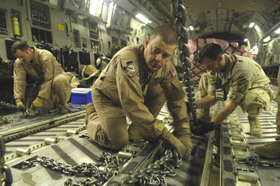 Airmen from the 816th Expeditionary Airlift Squadron at an air base in Southwest Asia prepare a C-17 Globemaster III for an airdrop mission Jan. 14 to deliver humanitarian supplies to coalition forces in Afghanistan