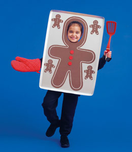 No cookie-cutter costumes here! Our sweet cookie sheet begins with lightweight foam core and silver poster board. We tied a ribbon wrist loop to the cookie kid’s spatula so she has a hand free for trick-or-treating.