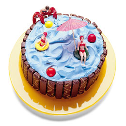 Now it’s time to take the plunge into the pool cake. For best results, serve it immediately and do not let it stand at room temperature for long. Store leftovers in the freezer. Feeds 10 to 12 hungry swimmers.