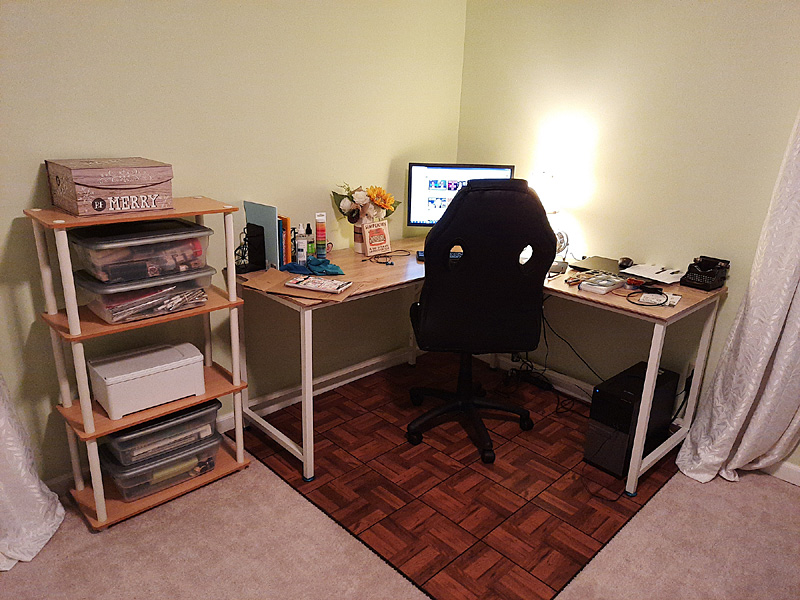 The white curtains were free (thank you Tiffany!) and I’m thinking of taking them to get them altered so the length comes to just under the window and not onto the floor. The boxes on the shelves are my bullet journal supplies. I used to have them in the Merry Christmas box on the top shelf but I quickly outgrew it. The white box on the shelf has my eyeglass cleaner and is a space for other stuff is that currently cluttering up my desk. But I LOVE having my own space and I’m hoping it will motivate me to actually start writing. (*snort* How many times have you heard THAT one??)