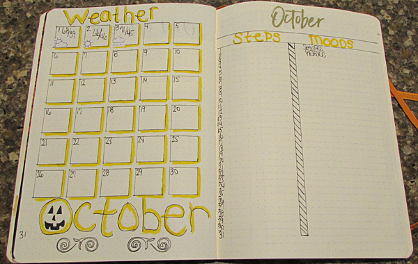 …. total hours of sleep and on the other page, I made a productivity “Bingo” chart. I know it’s not a full-sized Bingo card but let’s face it, I don’t assign myself things to do, I do what needs to be done when it needs to be done. But I thought I would make sure a few things are on the chart to motivate me to actually get it done this month. For instance, Preptober, journal, blog, walk, dinner with the boys, paint the house, mop the kitchen floor (because I H.A.T.E. to mop) and practice calligraphy. I went ahead and put in a calendar, too, just so I could keep track of my vacay days so when the day comes that I’m like, “geez! I haven’t had a vacation in MONTHS” I can look back and go, “Oh. I took one in October. Never mind.”