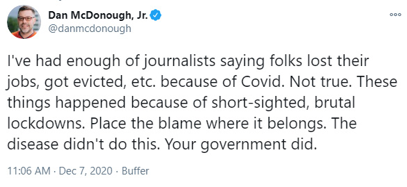 Nearly 20% of America’s restaurants have closed permanently because of the lockdowns and another estimated 10,000 will close before this pandemic is over. The government has intentionally decimated this industry. How can anyone feel less than rage over this?? IT’S WRONG AND EVIL to decide another person, or entity’s, future. My God, we are heading down a dangerous road here.