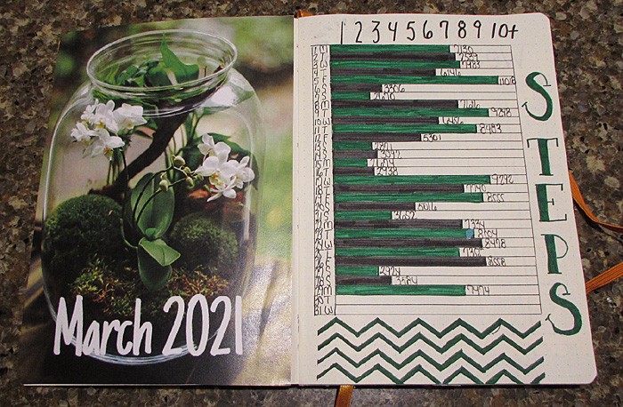 The cover page and my steps. I like the green and black – really pops. Don’t ask me why I put a arrow-thing design on the bottom of the page. I did that with my April steps page, too. All I know is that I have a packet of cool design templates and I’m dying to use them.