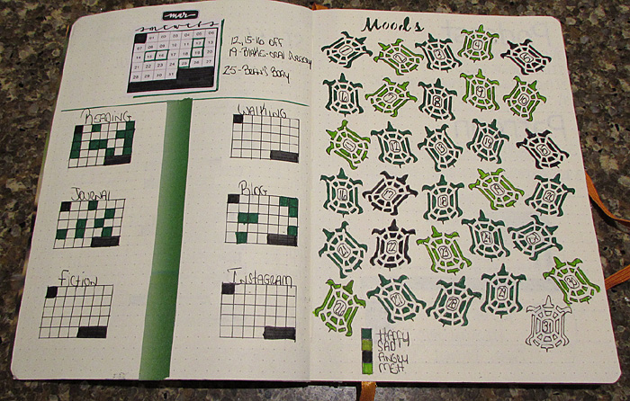 And my moods … cute turtles, right? However, I hated not having more than four emotions to choose from because let’s face it, I’m a complicated woman and I feel a minimum of 60 different emotions throughout my day and it annoyed me, (see?? Another emotion), that I didn’t have emotions to color in. I mean, sure, I had a lot of “meh” days, and thankfully, not very many sad days and probably too many mad days, but I was also productive, giddy, annoyed, irritated, and every other emotion you can name. So, I’ll be changing that up this next month but I had fun coloring in the turtles.