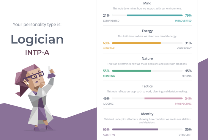 They may appear to drift about in an unending daydream, but Logicians’ thought process is unceasing, and their minds buzz with ideas from the moment they wake up. This constant thinking can have the effect of making them look pensive and detached, as they are often conducting full-fledged debates in their own heads, but really Logicians are quite relaxed and friendly when they are with people they know, or who share their interests. However, this can be replaced by overwhelming shyness when Logician personalities are among unfamiliar faces, and friendly banter can quickly become combative if they believe their logical conclusions or theories are being criticized.