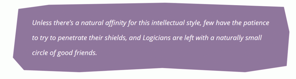 Logician friendships are knowledge-based, defined by the exchange of ideas, theories, and concepts, and those who aren’t able to keep up with this, or who have sharply differing tastes (don’t talk to Logicians about celebrities) will find stony faces that border on rude. To Logicians, communication is often more of a nuisance than a pleasure, and conversation is reserved for topics that they find meaningful, or for people they already like enough to stick it out.