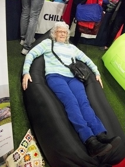 I was actually interested in it since Kevin and I go camping quite a bit, but it was just too weird and too expensive and I can’t even imagine what Kevin would think if I brought something like this home so I passed on it. But it looked comfy. Mom doesn’t look very comfy here, probably because people were walking by and stating at her, LOL, but she said it was comfy.