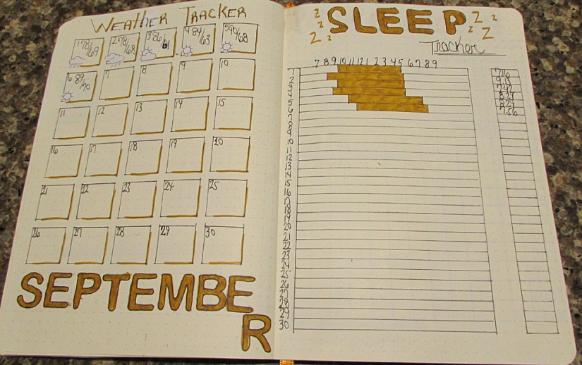 I goofed up on my sleep tracker page (shocker!) and was watching a YouTube video (shocker) while I was putting this together and accidentally put in “steps” instead of “sleeping” so I had to improvise and tear a piece of paper and put over the “steps” part. But you know what? I’m sort of digging it and I think I’ll do more of that in the future. Do you know how cheaply you can buy craft/construction paper? It’s like a $0.25 a piece. Or maybe that’s not that cheap considering it’s ONE PIECE OF PAPER.