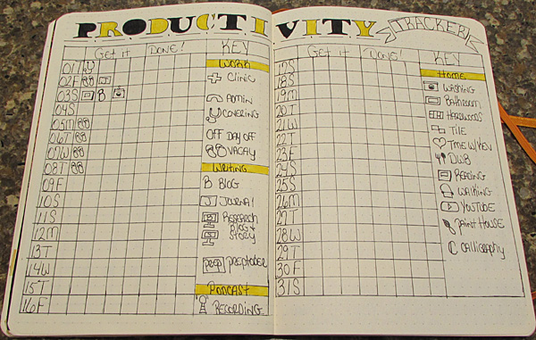 And lastly, my “productivity” tracker. As you can see, I changed it up a bit this month. I was getting depressed on my previous productivity tracker because I really don’t DO much. It’s the same thing, over and over and over again and though it was fun to make and fun to fill out, it was just … boring. So, I thought I would make these cute little trackers this time. As you can see, my fiction and cleaning trackers are blank. Yes, they are accurate. No, I don’t clean very often.