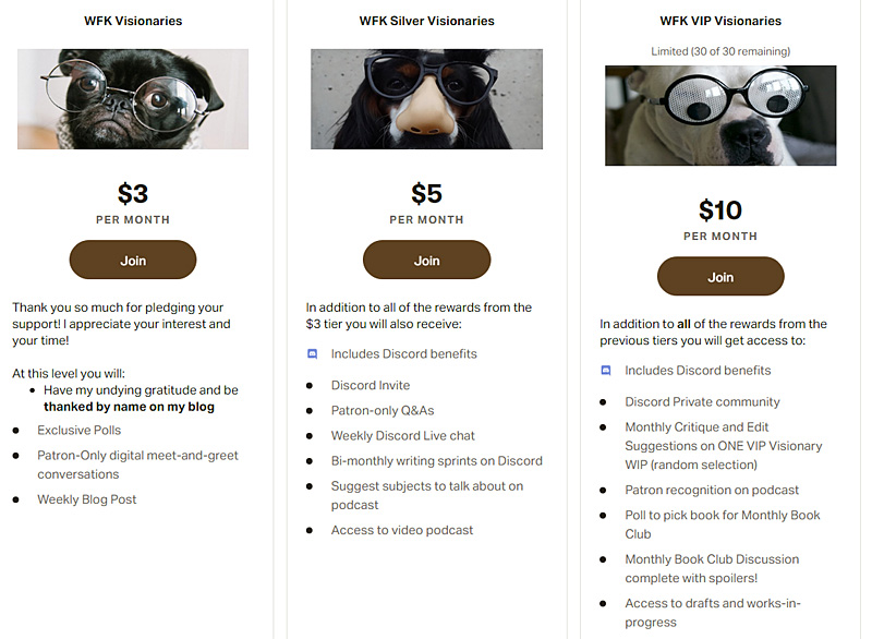 I plan on offering three tiers. I’m also working on teaching myself, and setting up, a Discord server. I thought it would be fun to host writing sprints and maybe a virtual book club. I think I’m going to limit my top tier to 20 people, just so it won’t be so big we can’t really get to know one another. Ideally, I’d like the top tier to be writers who are interested in potentially starting a writing club – where we critique each other’s work and/or be beta readers.