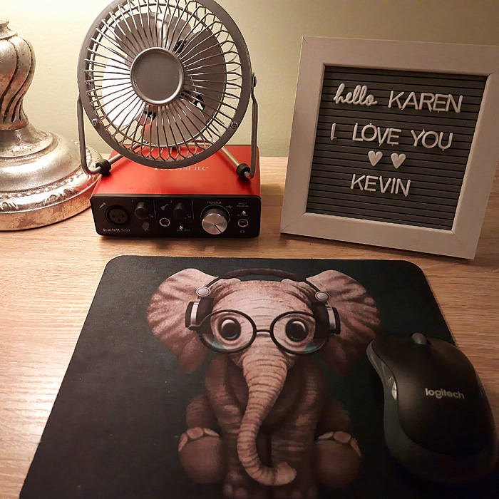 And the box under the fan? That’s the box thingie I use whenever I record my podcast. Oh. You didn’t know I had a podcast? Really? Where have you been?? Don’t ask me technical questions, that’s Kevin’s territory. I just show up and talk.