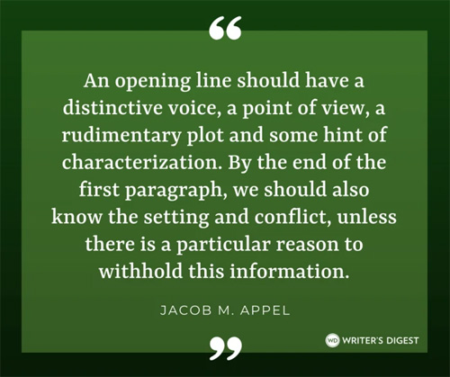 - Build momentum – “The first cardinal rule of opening lines is that they should possess most of the individual craft elements that make up the story as a whole. An opening line should have a distinctive voice, a point of view, a rudimentary plot and some hint of characterization. By the end of the first paragraph, we should also know the setting and conflict, unless there is a particular reason to withhold this information.”
