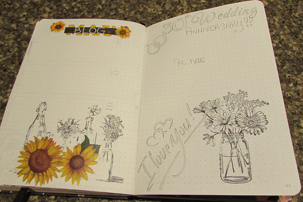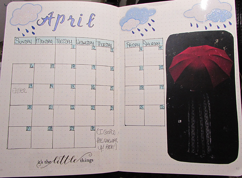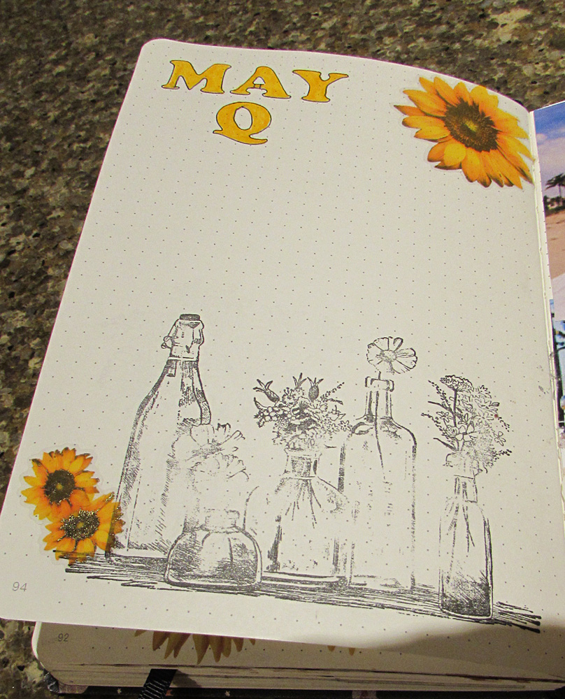 I have mixed feelings on calendar pages. Again, I don’t really use them because I’m boring as hell and never really have anything to write in them so they feel sort of a waste. I’m toying with the idea of making full page calendar artsy spreads in my next Bujo and just making a small monthly calendar but the thought of planning a full artsy spread triggers my productive gene and …meh. We’ll see. I actually had a few things to add to the calendar this month – look at me – I’M BUSY – so that’s satisfying. I got the sunflower stickers from Hobby Lobby which was a nice touch, in my opinion.
