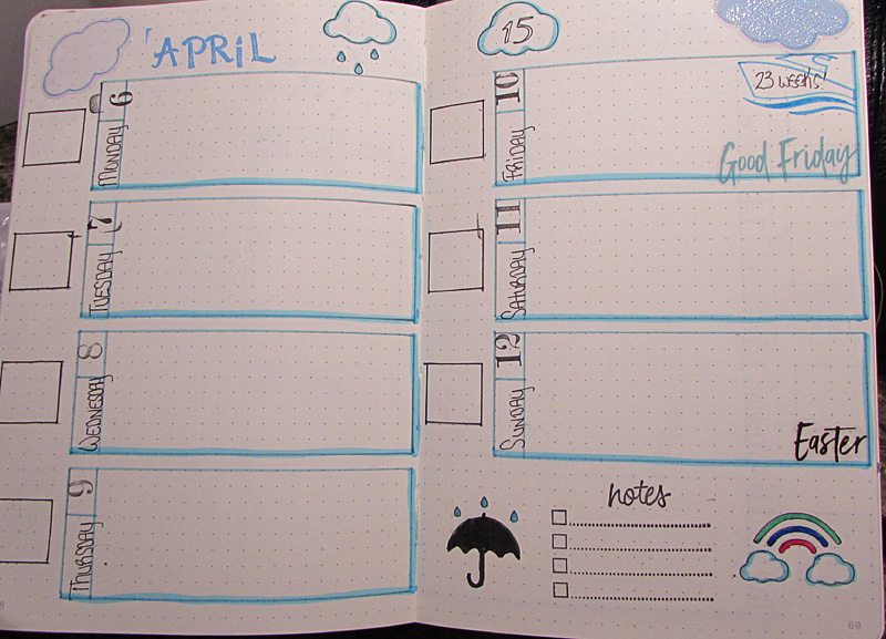 Weekly spreads are still the same – I like this layout. It givers me room to write some thoughts from each day. The little squares on the left are to track weather. I think in future weeklies, I’m going to skip the “important” section at the bottom and make a seven-day weather and fasting tracker. Hey! I have a few more tracker ideas. I lied.