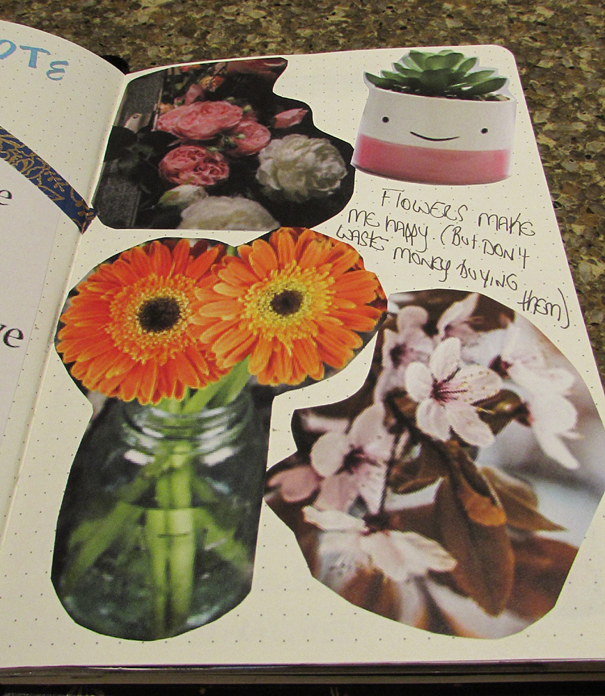 I’m doing the vision board thing. I’m picking out pictures from Unsplash that make me happy and putting a collage thingie together. (I send the files to Staples and have them print off the pages for me – it’s like ridiculously cheap doing it that way). This one sucks, but remember, I don’t have a crafty bone in my body so cut me some slack. I learned I don’t care for cutting around the pictures and haven’t done that since. Next month’s vision board page is better … but not much.