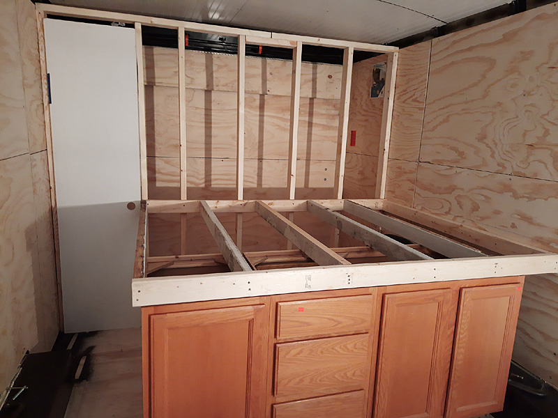 Kevin built our bed frame on top. Obviously, he will support it on the other side of the cabinets. I bought two narrow twin mattresses from Amazon for us to sleep on. I ordered two mattresses as opposed to just putting one mattress on there because I’m a fish out of water when I sleep and I don’t want to disturb him when I’m flopping around. This is how it’s set up on a cruise ship and we love it.