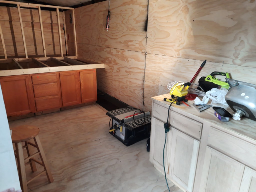 I think Kevin is going to start working on the kitchen next. He bought a sink at a home recycling center for $15 bucks. In fact, that’s where he has found most of the materials so far for the trailer – which works out great for us because we’re not wanting anything too fancy for this and we certainly don’t want to spend too much money on it.