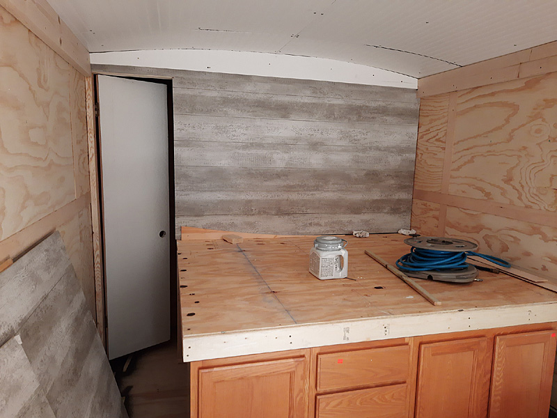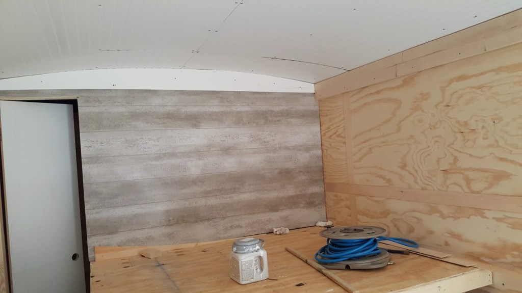 Kevin also built a back wall and put grey shiplap up. He plans on putting a toilet on the other side of that wall for our late-night pee breaks. (We’re old. We can’t go all night without peeing and neither one of us is thrilled with the idea of getting up, putting on shoes and then trekking to the campground bathrooms).